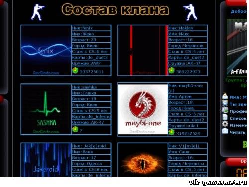 <TABLE class="tabs" border="1" cellpadding="0" cellspacing="0" align="center"><TBODY><TR><TD width="140" rowspan="8" class="tds"><IMG src="/images/avatarsostav/vampire128x128melky.gif"></TD><TD width="260" class="tds"><SPAN class="style1"> Ник:melkiy </SPAN></TD></TR><TR><TD class="tds"><SPAN class="style1"> Имя:Витя </SPAN></TD></TR><TR><TD class="tds"><SPAN class="style1"> Возраст:18 </SPAN></TD></TR><TR><TD class="tds"><SPAN class="style1"> Город:Киев </SPAN></TD></TR><TR><TD class="tds"><SPAN class="style1"> Стаж в CS:7 лет </SPAN></TD></TR><TR><TD class="tds"><SPAN class="style1"> Карты:de_nuke </SPAN></TD></TR><TR><TD class="tds"><SPAN class="style1"> Оружие:awp</SPAN><SPAN class="style1"> </SPAN></TD></TR><TR><TD class="tds"><SPAN class="style1"> </SPAN><IMG src="/images/icq.gif"><SPAN class="style1"> 577243618 </SPAN></TD></TR></TBODY></TABLE>
